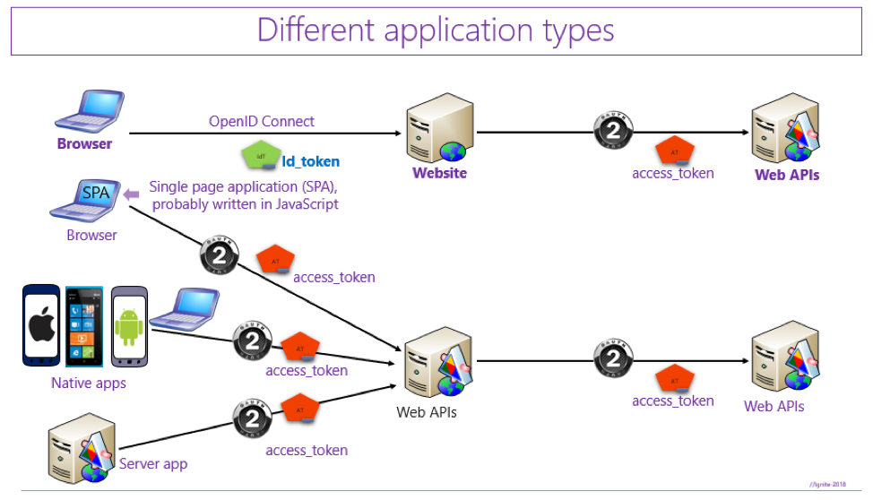 Now we have talked about different types of protocols, identity providers, web apps and web APIs, and token protocol support. If we combine all components, the process looks something like the diagram below. The diagram shows how applications talk to each other irrespective of application code language. I want us to focus on the complexity involved when we migrate an on-premise application. An architect must follow all these complexities very carefully.