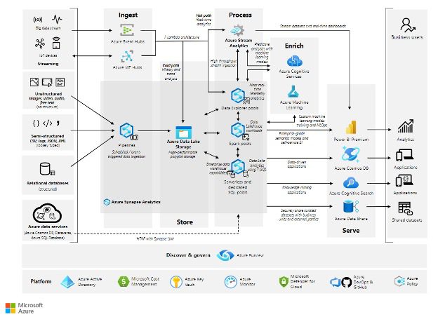 This diagram shows a similar architecture that follows Microsoft’s guidelines. Within the diagram, a combination of Azure services helps ingest, process and store data from a variety of sources, including structured, semi-structured, unstructured and streaming. It shows how data and insights are ingested, stored, processed, enriched and ultimately served through Azure services to the business users for analysis and use in business decisions.