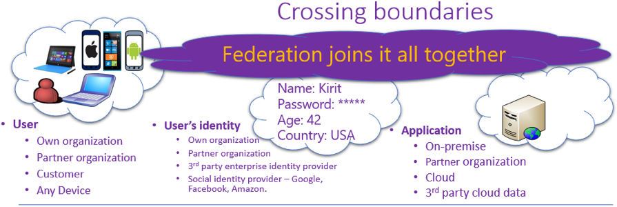 To make a hybrid identity work, we heavily leverage identity federation. Federation delegates authentication and, therefore, removes the siloed app authentication repositories. It lessens identity management responsibilities for the apps, and it also allows users to leverage an existing identity. Federation also helps in delegating authorization. Applications can change authorization data as appropriate.