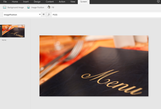 Since this will be the first screen that appears when the PowerApp is started, I’m going to add a background image, and some navigation buttons. As we add new screens, we’ll wire up each button to allow navigation to occur when clicked.